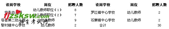 一、招聘范围及人数:1.面向容县现在岗代课人员招聘乡镇小学教师30名;2.面向容县原代课人员招聘乡镇小学教师8名;3.面向玉林市应往届师范类普通高校毕业生或普通中等师范学校毕业生招聘城区幼儿教师24名;4.面向容县应往届师范类普通高校毕业生或普通中等师范学校毕业生招聘乡镇幼儿教师6名。具体招聘岗位和人数见附表。