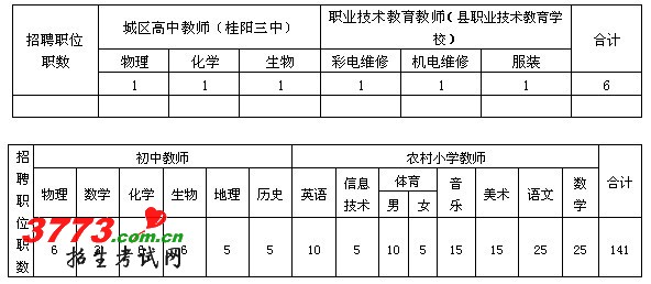 湖南省桂阳县2011年公开招聘教师公告 县委、县政府研究决定,2011年面向社会公开招聘147名教师。现将有关事项公告如下。 (二)义务教育阶段学校招聘职位、职数