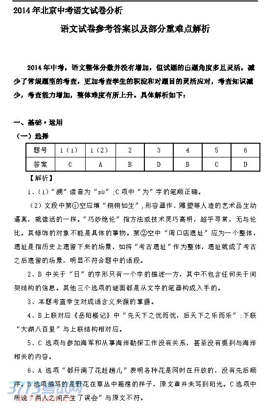 [组图]2014北京中考语文试题答案及解析发布