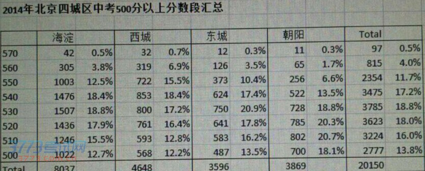 [图文]2014北京中考成绩500分以上分数段汇总(四城区)