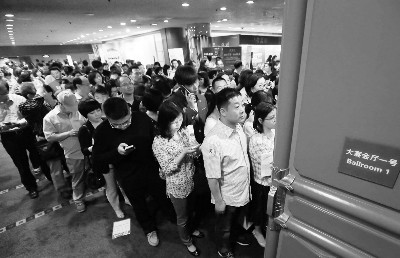 昨天(17日)国际教育咨询会现场,因为人多限制流量,家长们在门口排起长队 摄/法制晚报记者 柴程