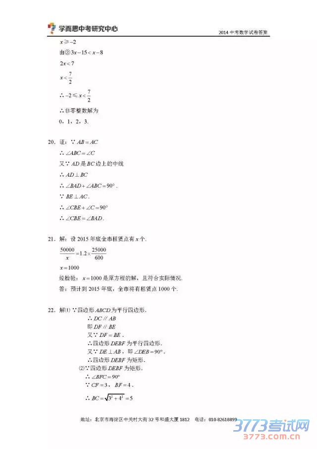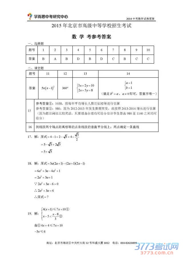及时公布北京中考试题、答案和中考作文。祝各位考生都能取得好的成绩。2015年北京中考数学试题答案(图片版):