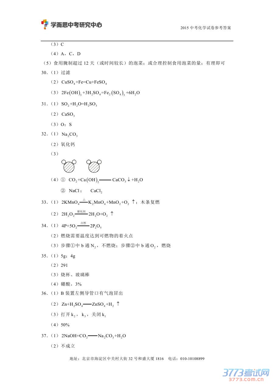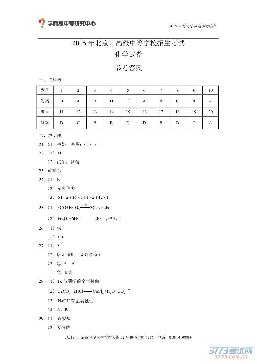 [组图]2015北京中考化学试题答案发布
