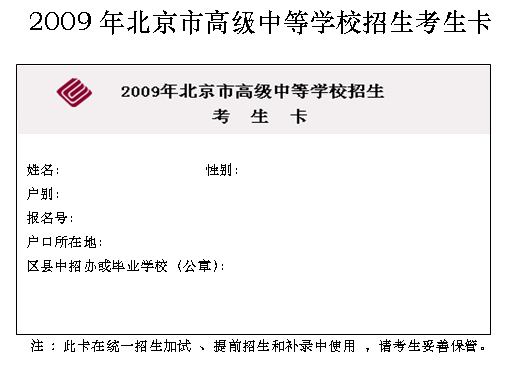 2009年北京市高级中等学校招生考生卡