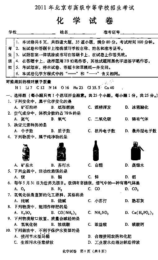 [组图]北京2011中考化学试题试卷及参考答案