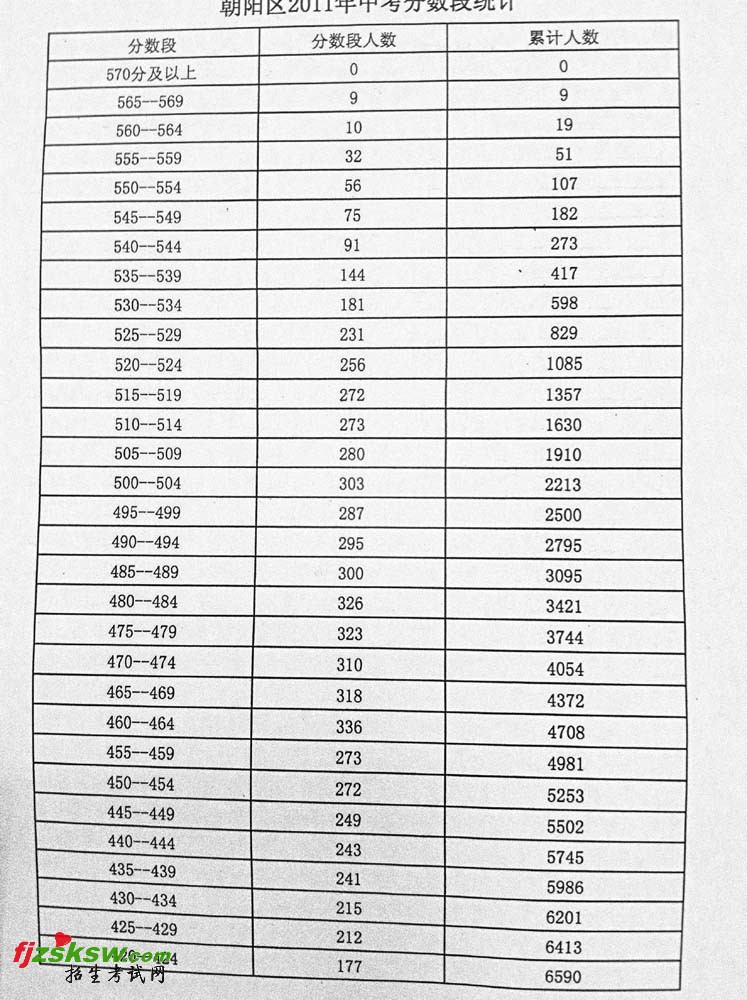 [图文]北京2011中考朝阳分数段与累计人数统计表