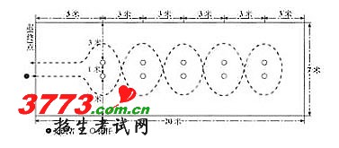 考试场地长20米,宽7米。起点线前5米处开始设置标志杆,共设5排,每排2根;各排标志杆之间相距3米,同排的两根标志杆底座中心点之间相距1米,距同侧边线3米。设置方式如图所示: