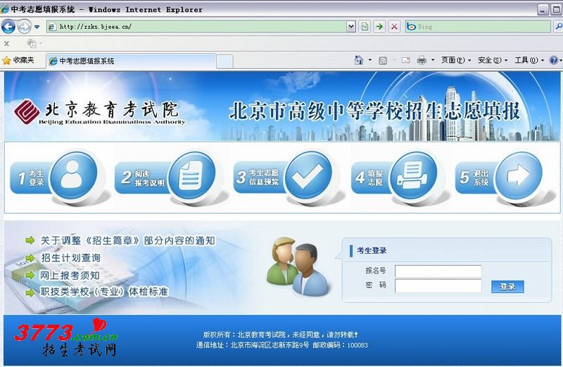 (一)考生登录 1、考生首先登录北京教育考试院网站,网址为:http://www.bjeea.cn 2、点击主页右上角“报名报考”图标,打开“报名报考”页面,点击“2012年北京市高级中等学校招生网上志愿填报”的链接,进入中考网上志愿填报登录页面。 |