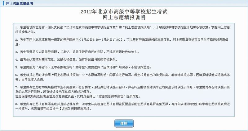 请认真阅读填报说明,阅读完毕后点击【继续】按钮进入考生志愿信息预览页面。 |
