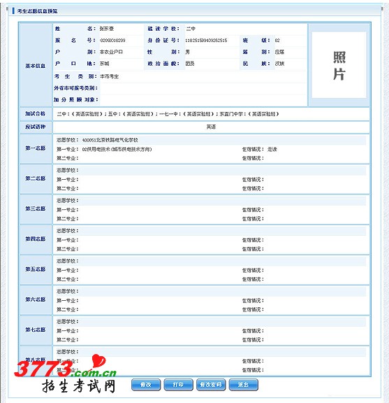 请考生认真核对基本信息、加试合格信息和体检信息。这三项信息不能修改,如有异议请与就读学校联系。 点击【打印】按钮生成中考志愿填报表,考生可以用A4纸打印。 点击【修改密码】按钮修改考生登录密码,进入考生登录密码修改页面 |