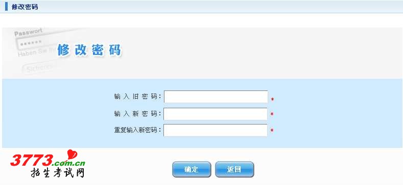 输入旧密码、新密码、重复输入新密码后点击【确定】按钮,页面提示“密码修改成功”完成密码修改操作,点击【返回】按钮返回到考生志愿信息预览页面。 |