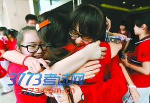 26日,中考英语考试结束,北师大实验中学分校考点的考生们走出考场后拥抱庆祝。记者 方非摄