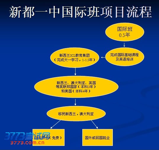 根据中西方国家教育体系的不同,国际课程实验班成功地解决了留学中可能出现的不确定问题,并且能够在学生出国前给学生一个明确的学习方案,在留学期间能够及时反馈孩子在国外学习生活的情况,提供一个畅通的交流平台,解决了家长们的后顾之忧。 ![]() 国际课程实验班期间学习的内容为两门国外大学基础课程(商务英语、商务交流)以及英语听、说、读、写和口语强化课程。期间采取国外大学的过程管理模式,将学生的出勤率和每次作业以及考试的成绩计入期末总评。 国际课程实验班的学习时间在新都一中为一学期完成两个大学学科的学习,之后来到新西兰ICL教育集团学习1-1.5年的时间完成另14门课的学习(若语言未通过的学生则需在新西兰先学习12-24周的语言强化课程)拿到ICL商科文凭,然后升入新西兰,澳大利亚,英国,美国等超过四十所公立大学,再进行1-2年的学习获得本科学历。因此,对于国际课程实验班的学生来说,只需3-4年的时间就能拿到本科文凭,而且就读国际课程实验班的学生,不需要通过雅思和大学入学考试就能进入大学课程的学习。 |