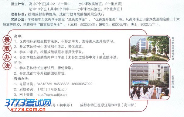 成都市田家炳中学2013年招生简章出炉。2013拟招收7个班。田家炳高中的录取方式有,本校直升、区内指标到校生、艺体特长生、中考志愿填报该校者、自主招生考试。
