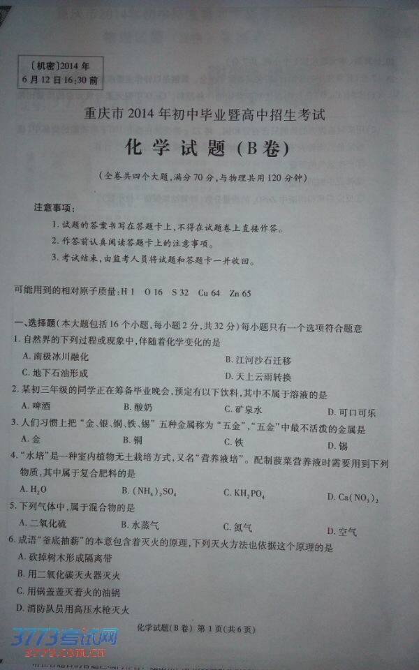 2014年重庆中考于6月12日开考。为了方便大家查看试题,3773中考网频道为大家及时发布中考作文,中考试题,试题答案,试题点评,希望大家考出好成绩!