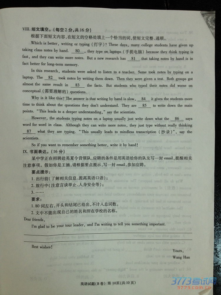 [组图]2015重庆中考英语B卷试题发布