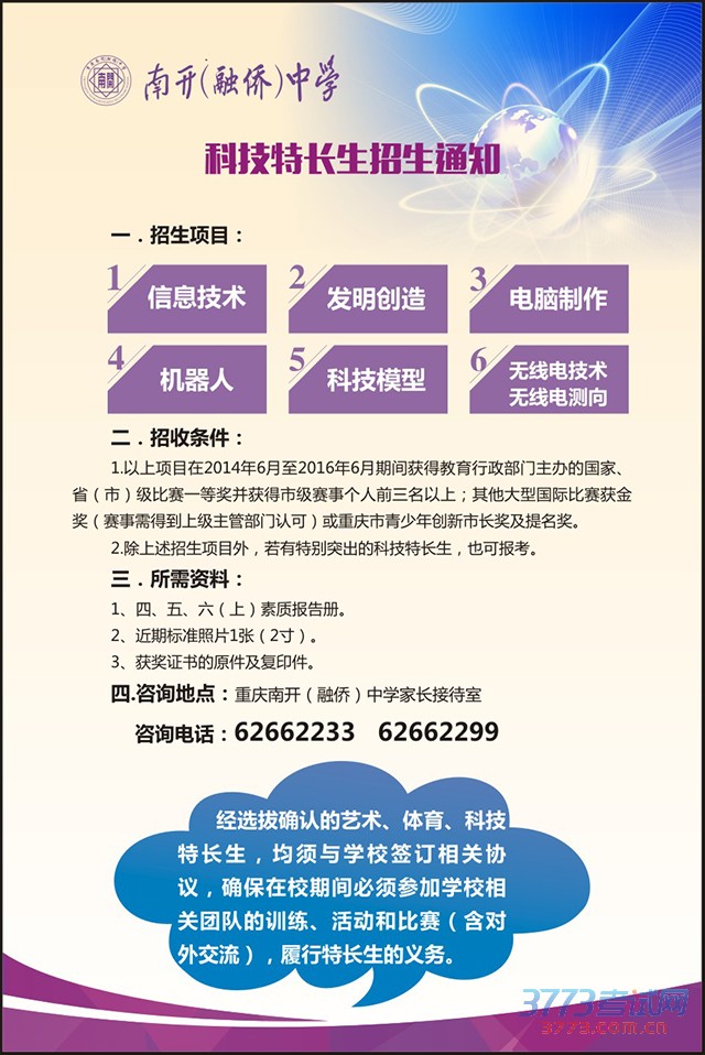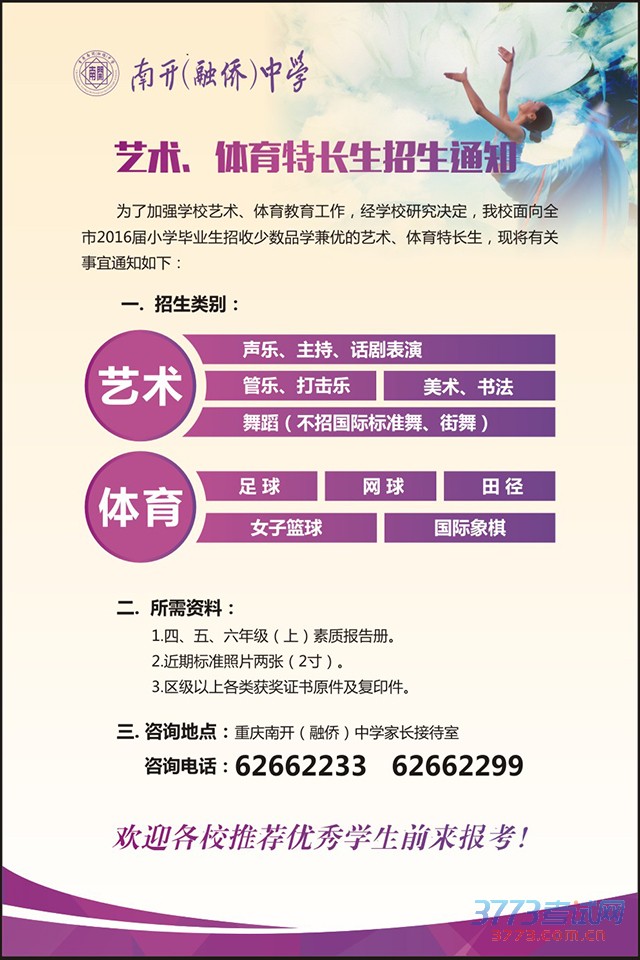 [组图]2016重庆南开融侨中学艺体科技特长生招生通知