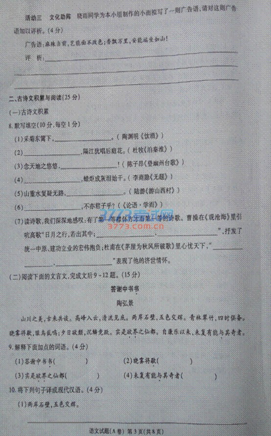 [组图]2016重庆中考语文A卷试题发布