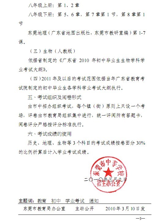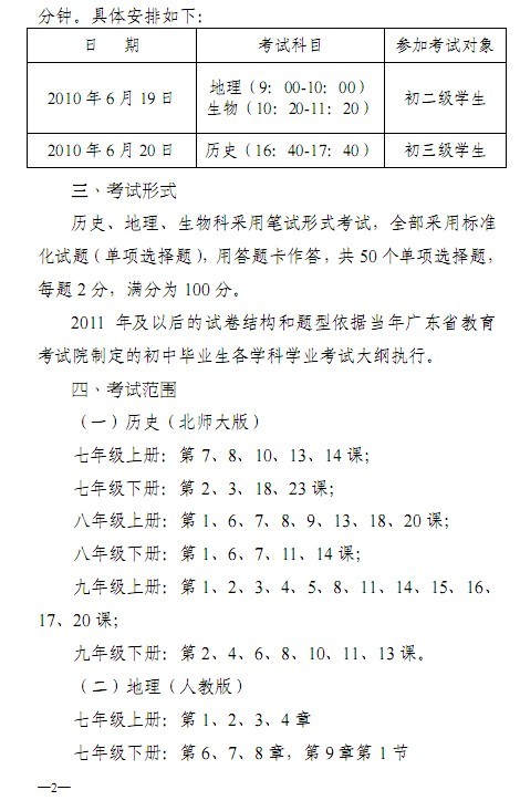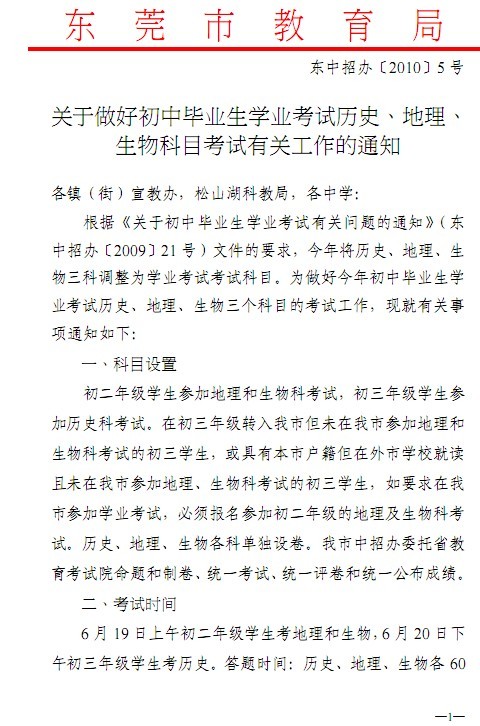 [组图]2010年东莞中考历史地理生物科目考试时间范围