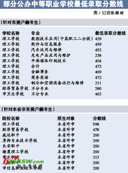 而昨日,9所公办中等职业学校面向本省非东莞户籍的应届初中毕业生的最低录取分数线也同步公布。其中,东莞理工学校的最低录取分数线媲美重点高中,达到了598分。经济贸易学校的最低录取分数为478分。威远职中、厚街专业技术学校、长安职中、塘厦理工学校、大朗职中、市信息职业技术学校等学校的最低录取分数线均为200分。