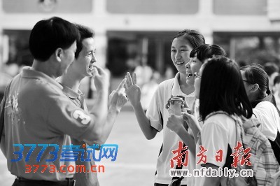 昨日傍晚,东莞南城中学考点,考试结束铃声响起后,考生们走到校门口边与老师谈论着考试的情况。记者 苏仕日 摄