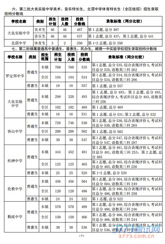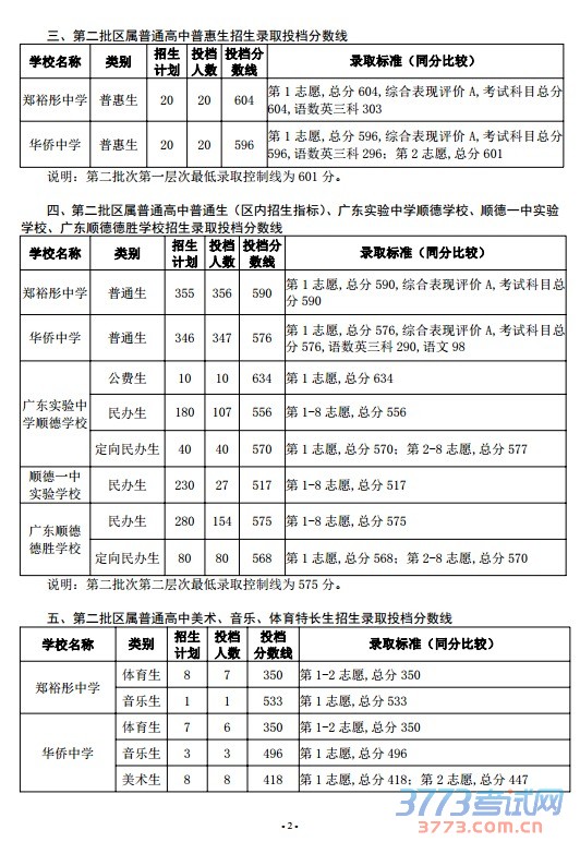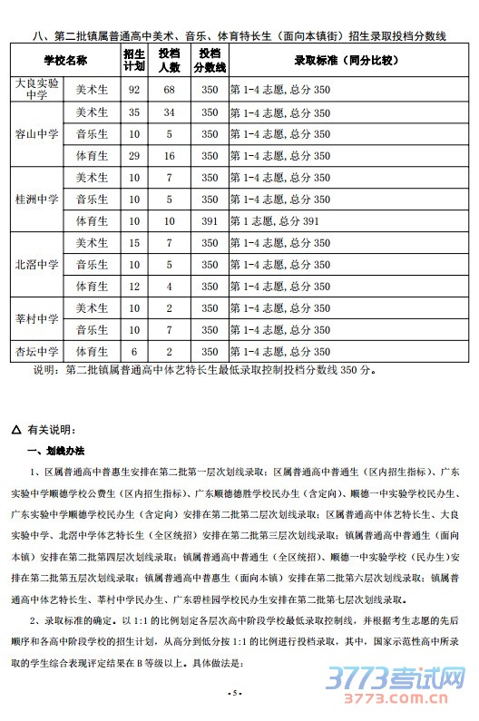本镇)安排在第二批第四层次划线录取;镇属普通高中普通生(全区统招)、顺德一中实验学校(民办生)安