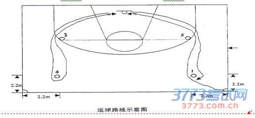 测试者自由组合,两人一组,测试者站在2号位,抛球者站在1号位,测试者接到由1号位抛来的球后,要求把球传到3号位距网垂直距离