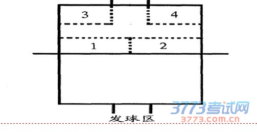 测试者手持毽球,站在发球区内,将球发向对面半场的1、2、3、4号位;发球不准犯规,球出有效区外无效;测试者每人发10次,按有效次数计算得分。