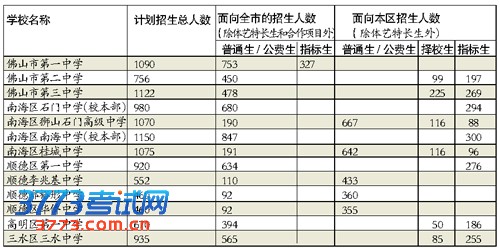 本报讯 (文/表记者陈昕宇)佛山市教育局昨日公布2013年佛山市高中阶段学校招生生源计划,记者从计划表中了解到,今年普通高中的招生计划达到39031人,比去年增加1652个招生名额,其中面向全市招生的普通生增加446人,面向区内招收的普通生增加743人。由于今年进一步压缩择校生比例,佛山一中、石门中学、顺德一中、南海中学全部取消择校生,普通高中择校生的名额也由去年的3638人降至2961人。