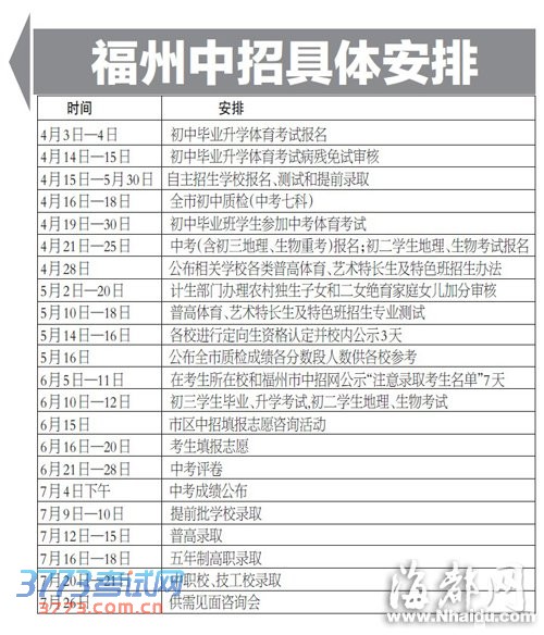 福州市中招办昨日发布了2014年福州中招实施细则,今年中考将从往年的三天缩为两天半。同时,调整了录取一级达标校的部分等级学科等级要求,定向生比例也再度提高到45%。