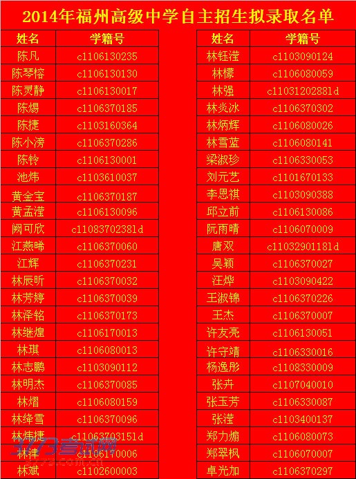依据《2014年福州高级中学自主招生简章》规定,我校于5月10日举行自主招生考试。学校采用网络阅卷,每份试卷都经过双评,双评分值超过误差允许范围的试卷实行三评,依据考试成绩择优确定前50名拟录取学生名单,现予以公示,公示时间5月14日至5月16日。