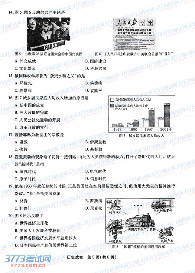 [组图]2014福州中考历史试卷及答案发布
