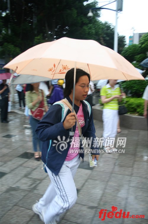 10日一早,榕城下起了大雨,但丝毫没有影响考生的行程。8点15分,在福州三中考点前,绝大部分考生都已按时进考场。一两位稍迟的考生,也赶在8点20分前顺利进入考场。和高考相比,无论是考生还是家长,心态都要更轻松一些,很多学生都是自己打的到考点的。考点门口少了望眼欲穿守候的陪考家长,只有数十个家长撑着伞,在路边看着孩子进入考场后,就忙自己的事去了,一切显得更加平和宁静。