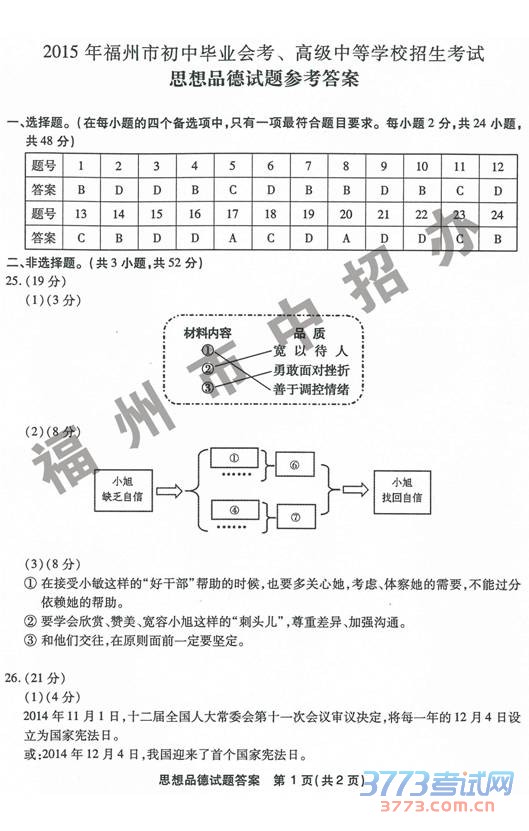 2015福州中考思想品德试题及答案发布