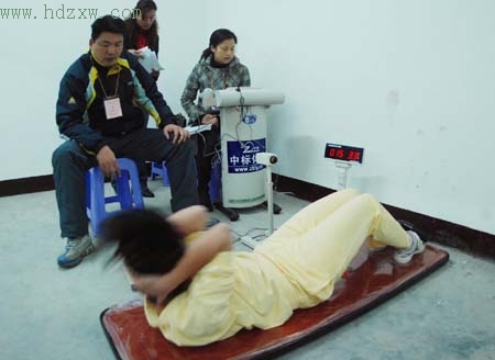 本报讯 仰卧起坐,大家最常见的就是,一个人躺在垫子上,另一人压住他(她)的双脚,然后开始做动作。然而,昨天开始的福州体育中考考场上,就让人长了见识。仰卧起坐根本不要别人帮助压住双脚,一个人自己就可以完成整套动作,而且动作规范与否也不是人说了算,而是“电子考官”告诉你合格与否。