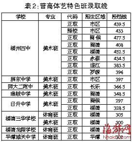在提前批,共有20所普高招收体育、艺术特色班,在前期专业测试合格的基础上,在中考最低控制线330分以上,以中考成绩从高到低录取。福州四中美术班完成市区的招生,但在七县市均未完成择校生的招生,同时在长乐还没有完成正取招生。屏东中学美术班在市区完成招生(具体已招满的学校录取线见表2)。