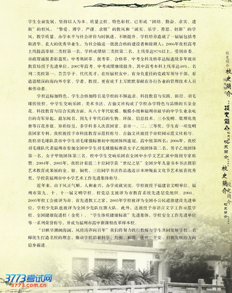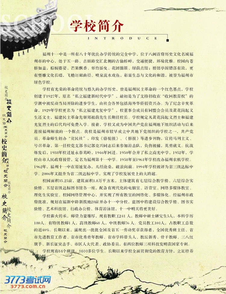 福州十一中简介 福州第十一中学创建于1927年,是一所市属全日制完中,2006年学校晋升为省二级达标中学。现有62个教学班(其中初中36班,高中26班),在校生共3082人。校园占地总面积63.25亩(劳动路校区面积35.25亩,市政府划拨新建分校用地28亩),有综合教学楼,综合实验楼,图书馆,有200米塑胶跑道的田径场,古榕、翠树、竹丛、草坪、花坛点缀着花园式的学校,一个绿色人文数字化的生态校园已初具规模。新校区将建有综合教学楼、图书实验楼、艺术科技馆、行政办公楼、体育游泳馆。学校师资力量雄厚、素质优良,现有教职工221人,专任教师198人,中、高级教师占教师总数的60%。 近年来学校连续评为省文明校、市第八、九、十、十一届文明学校、区文明单位,全国小公民道德建设先进单位、省先进教工之家、市科技教育示范学校、全国健康促进校(金奖)、市创安先进单位、市民主管理先进单位、市先进家长学校、市暑期青少年教育工作单位、全国少先队红旗大队、市“红旗团委”、市共青团工作先进单位、市“先进学生会”、市图书馆工作先进单位等光荣称号。 地址:福建省福州市鼓楼区劳动路18号 电话:0591-87553457