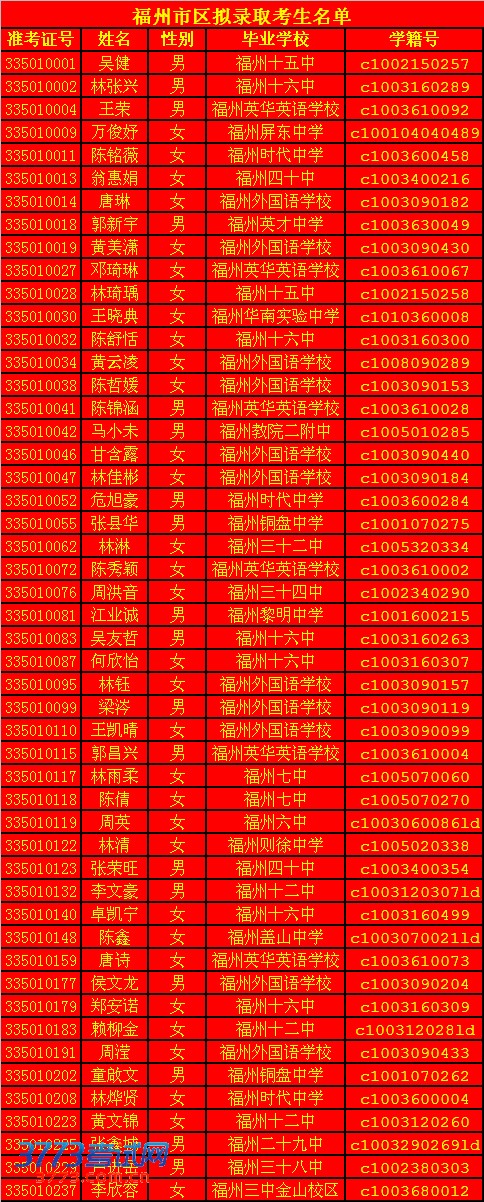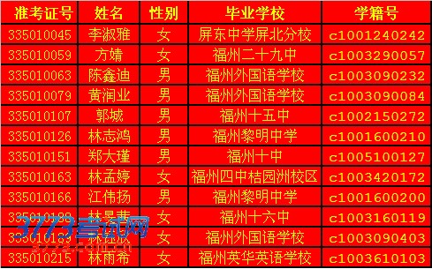 依据《2013年福州高级中学自主招生简章》规定,我校于5月12日举行自主招生考试。学校采用网络阅卷,每份试卷都经过双评,双评分值超过误差允许范围的试卷实行三评,依据考试成绩择优确定前78名拟录取学生名单,现予以公示,公示时间5月14日至5月16日。