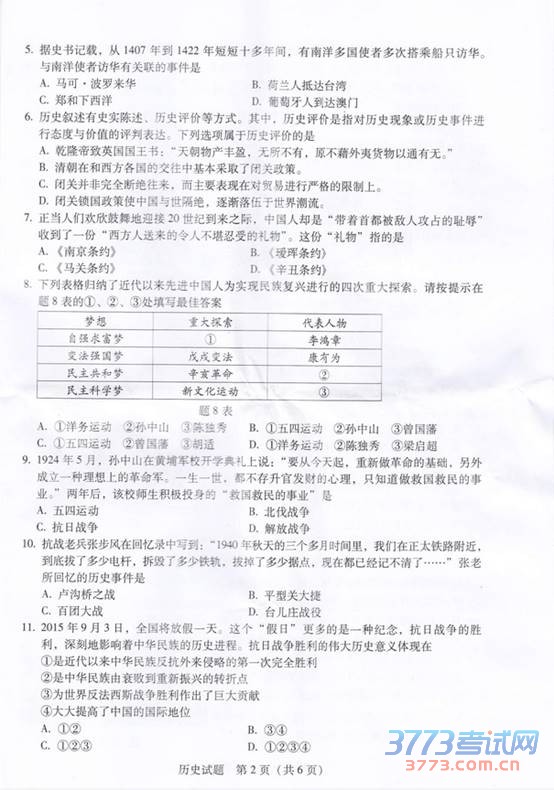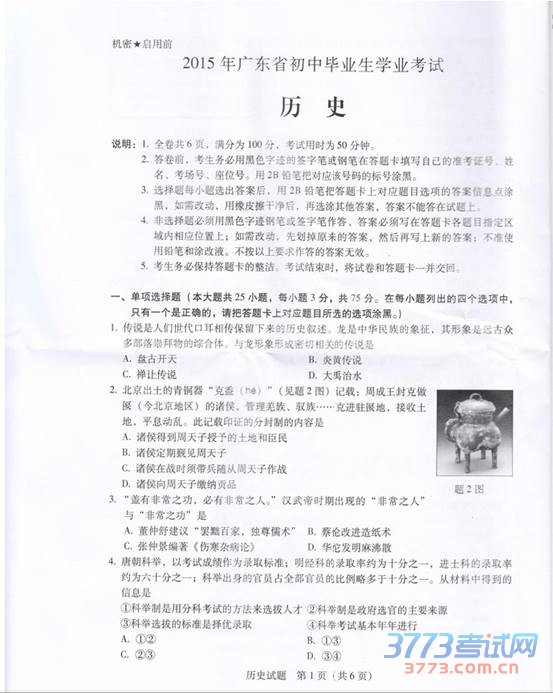 广东中考试题、答案和中考作文。祝各位考生都能取得好的成绩。2015年广东中考历史试题及答案: