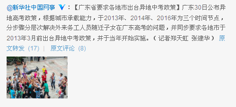 【广东省要求各地市出台异地中考政策】广东30日公布异地高考政策,根据城市承载能力,于2013年、2014年、2016年为三个时间节点,分步骤分层次解决外来务工人员随迁子女在广东高考的问题,并同步要求各地市于2013年3月前出台异地中考政策,并于当年开始实施。(记者 郑天虹、张建华)