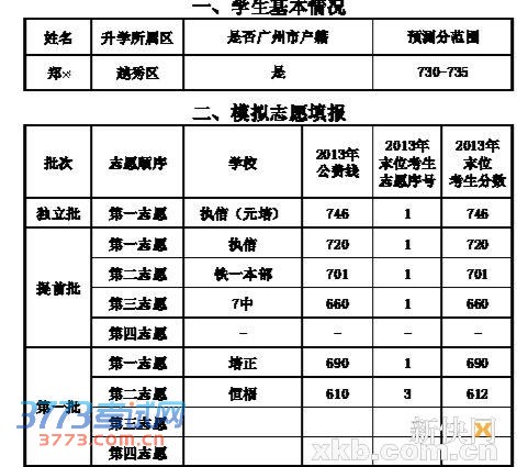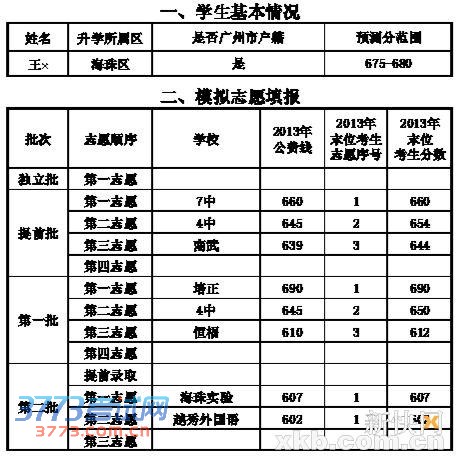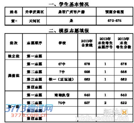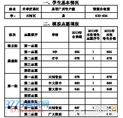 2.提前批:因预测分<优先投档线,若要增加第二、三志愿的有效性,需填报一些往年末位考生志愿序号为2的学校,最好是本区的示范性高中,如天河中学、89中等,增加提前批录取机会。