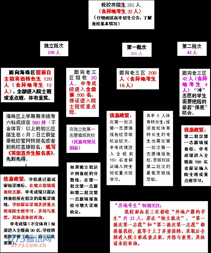 1、在独立批次招老三区学生150人(含异地考生12人)。全部编入我校院士班或重点班,其中面向海珠区提前自主签约招收英语特色生110人;在中考的独立批招老三区学生40人(须在“独立批次”填报才能录取)。