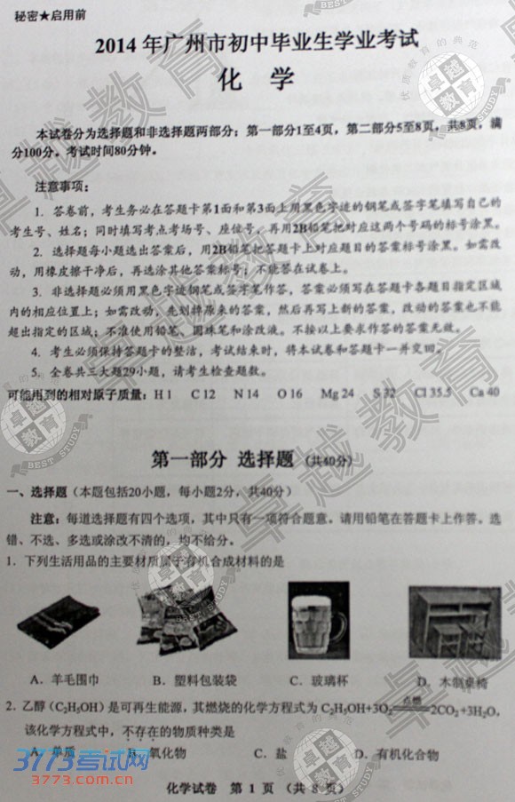 [组图]2014广州中考化学试题试卷发布