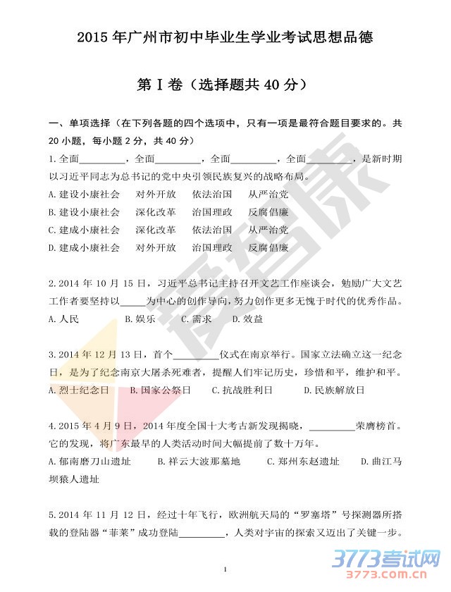 广州中考试题、答案和中考作文。祝各位考生都能取得好的成绩。2015年广州中考政治试题(图片版):