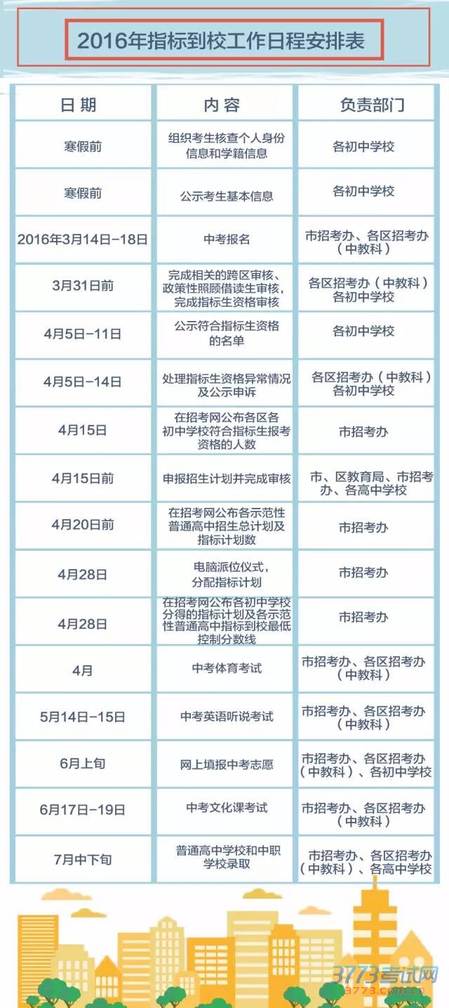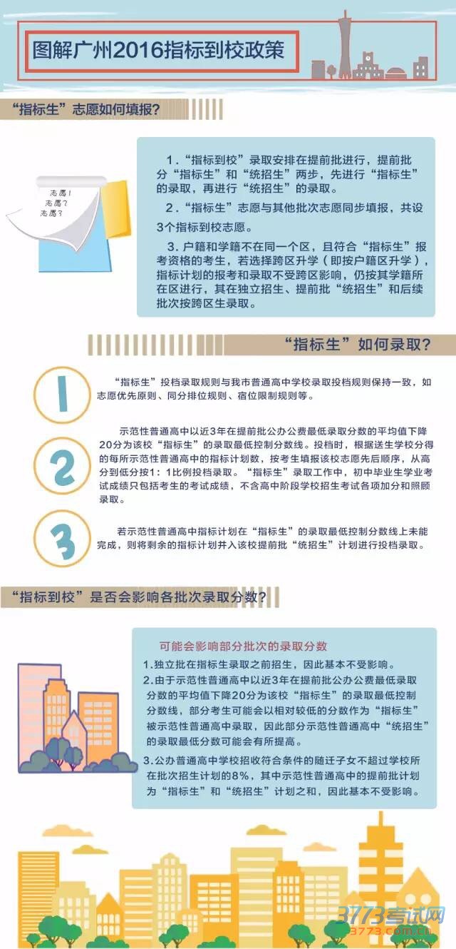 根据初步估计,今年全市41所省市属示范性高中大约有9000多个学位面向全市近500所初中学校进行指标分配。指标到校录取安排在提前批进行,提前批分指标生和统招生两步,先进行指标生的录取,再进行统招生的录取。指标生志愿与其他批次志愿同步填报,共设3个指标到校志愿。