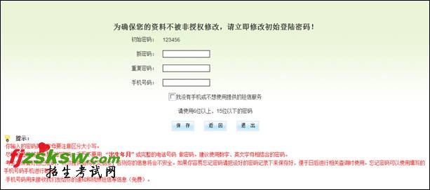请认真阅读“提示”,重新设置后点击“保存密码”确认,勿必记住新密码,以便日后修改报名信息、填报志愿、查询成绩等。注意,英文字母要区分大小写!手机号码用来免费接收我们发给你的通知、成绩、录取结果等信息的短信。