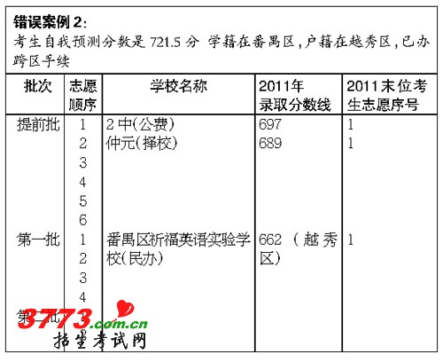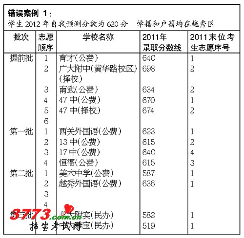 朱虹表示,从这个学生的志愿填报情况不难看出,该生是具有广州市户籍或者是不具有广州市户籍但享受政策性照顾借读,能报读广州市的公办高中公费及择校或者是民办高中;其次是学生的自我预测分数是高过2011年提前批的优先投档线30多分,应该说2012年上提前批的优先投档线把握是非常大的。