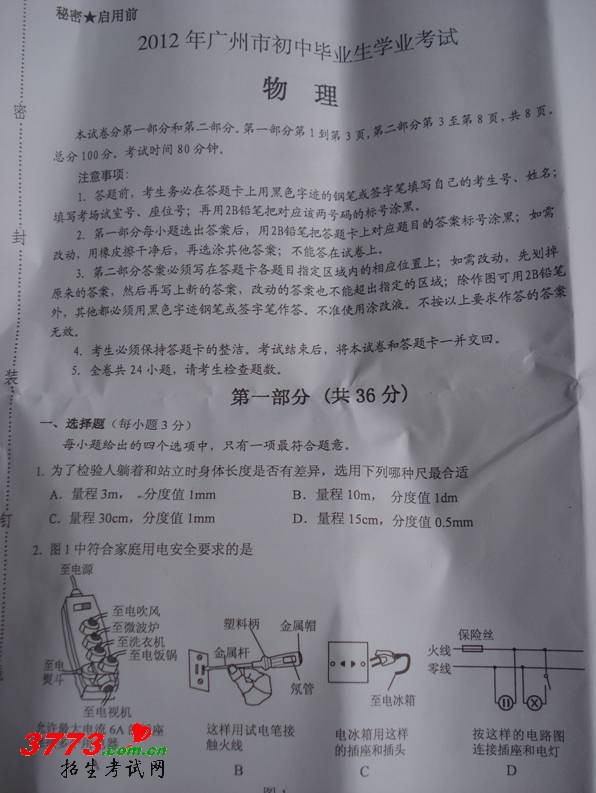 2012年广州市初中毕业生学业考试 2012年广州中考物理试题答案及评分标准