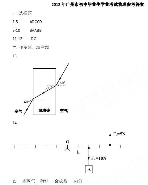 [组图]2012年广州中考物理试题答案及评分标准