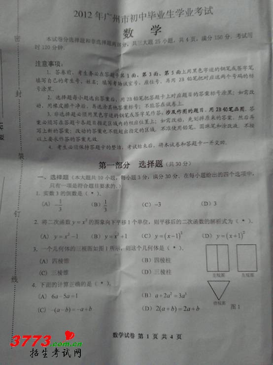 2012年广州市初中毕业生学业考试 2012年宁波中考数学试题答案发布